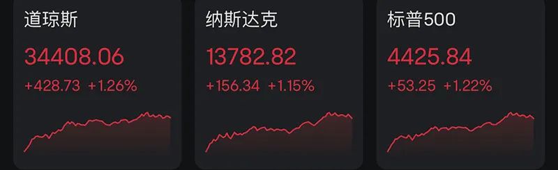好意思联储“休”息的影响力还在握续。当地时辰周四,好意思国股市飘红,三大指数全线收涨,涨幅均超1%。截止收盘,谈指涨428.73点,涨幅为1.26%,报34408.06点;标普500指数涨53.25点,涨幅为1.22%,一语气第6个走动日收高,连涨时长刷新2021年11月以来新高,报4425.84点;纳指涨156.34点,涨幅为1.15%,报13782.82点。